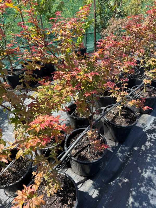 Shindeshojo Maple (Acer palmatum ‘Shindeshojo’) is a highly ornamental Japanese maple cultivar prized for its brilliant seasonal colour changes. In spring, new leaves emerge in a striking bright crimson to scarlet red, creating a dramatic display. As the season progresses, the foliage gradually softens to green, then turns vibrant orange and red tones again in autumn.