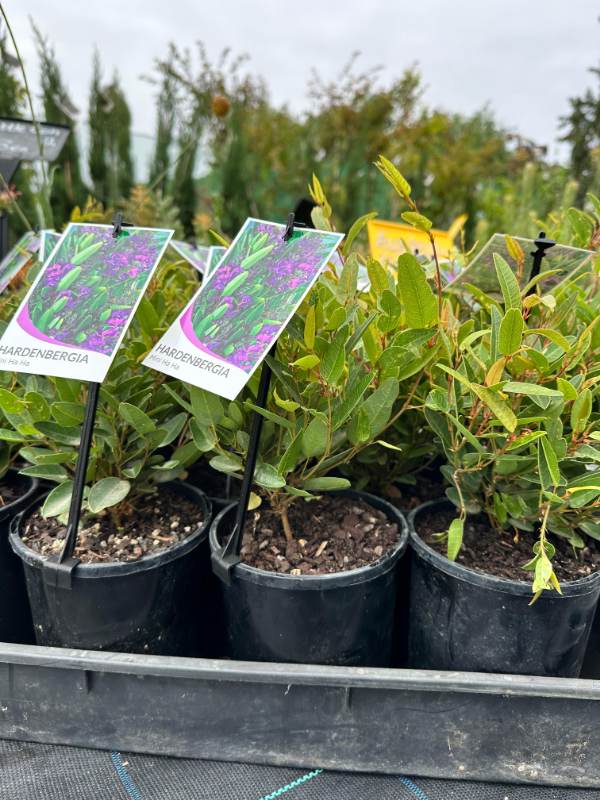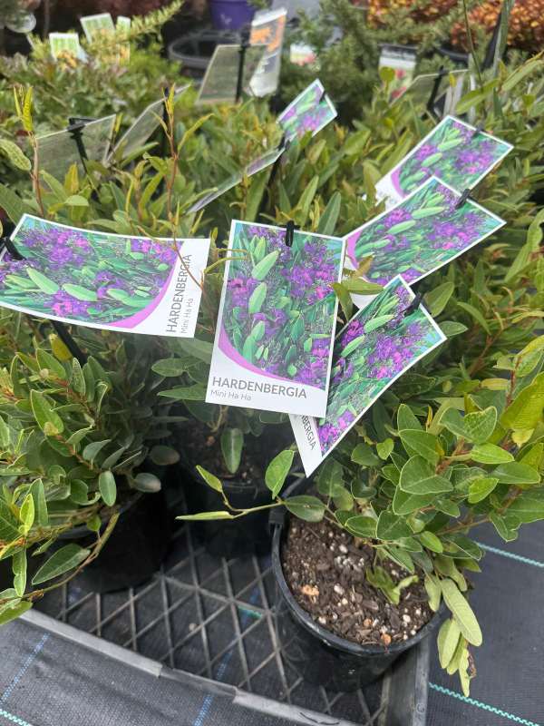 Hardenbergia ‘Mini Ha-Ha’ is a compact, evergreen climbing plant valued for its vibrant flowers and versatile growth habit. It belongs to Hardenbergia violacea, a species native to Australia, widely cultivated for ornamental purposes.