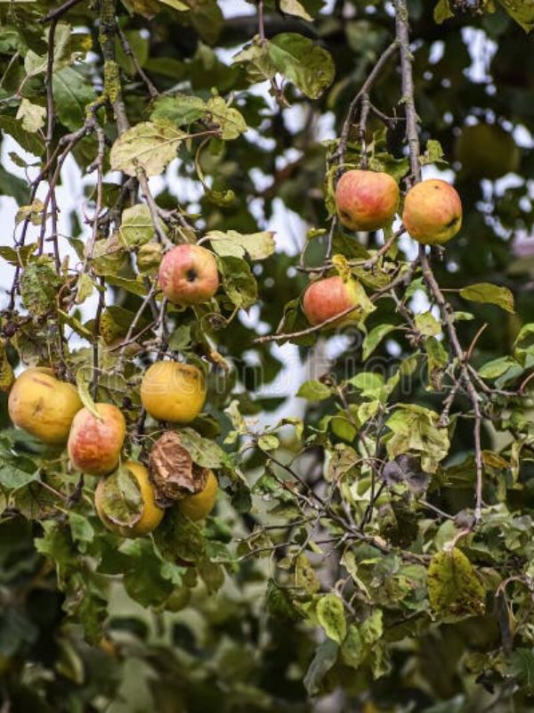 The tree produces pendulous branches that create a graceful, cascading canopy. In spring, it is covered with clusters of white blossoms, which attract pollinators and enhance its ornamental appeal. These flowers develop into small to medium-sized apples with red-blushed yellow skin and sweet, juicy flesh suitable for fresh eating and desserts.