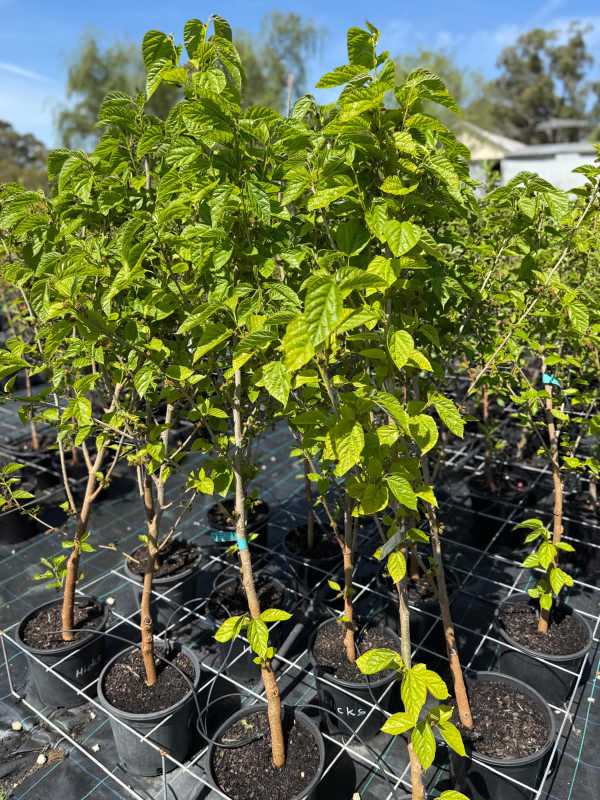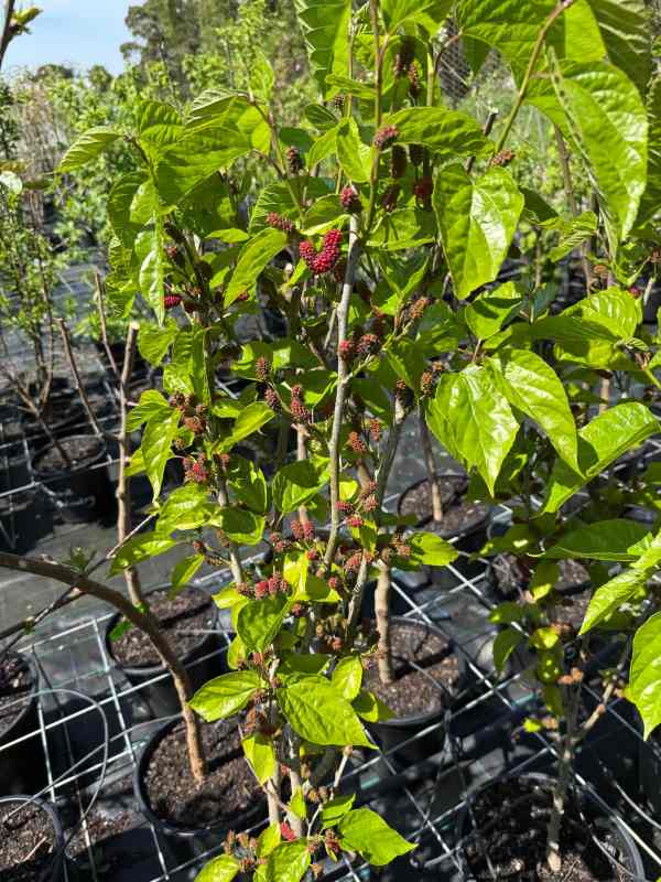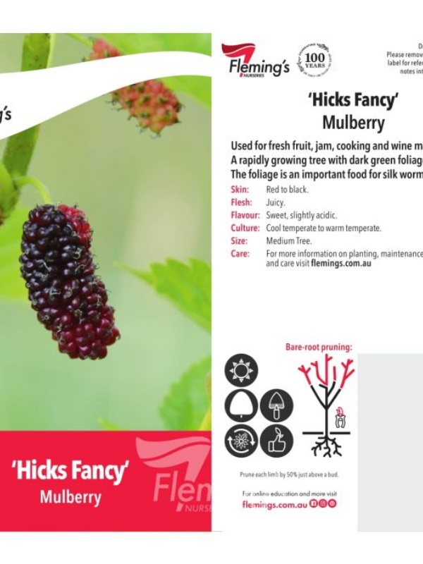 This variety typically grows to around 6–8 metres tall and 5–6 metres wide, with a broad, rounded canopy. It performs best in full sun and well-drained soil, and is tolerant of drought and light frost once established. Hicks Fancy Mulberry is a productive, ornamental, and long-lived tree that makes an excellent addition to home orchards, large gardens, or rural properties.