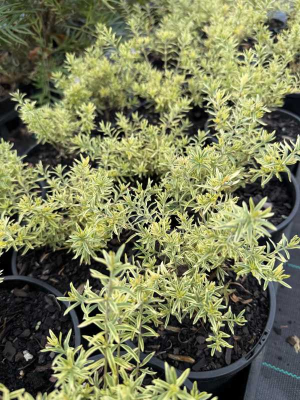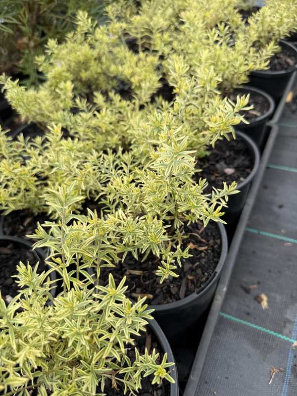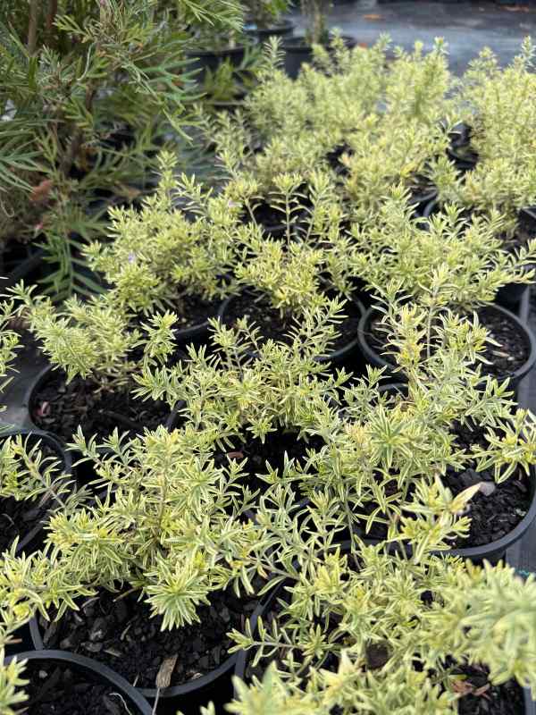Westringia fruticosa ‘Variegata’ is an attractive evergreen shrub valued for its soft grey-green foliage edged with creamy white margins. This variegated form creates a bright, textured look in the garden and is commonly used for hedging, borders, and coastal landscapes.